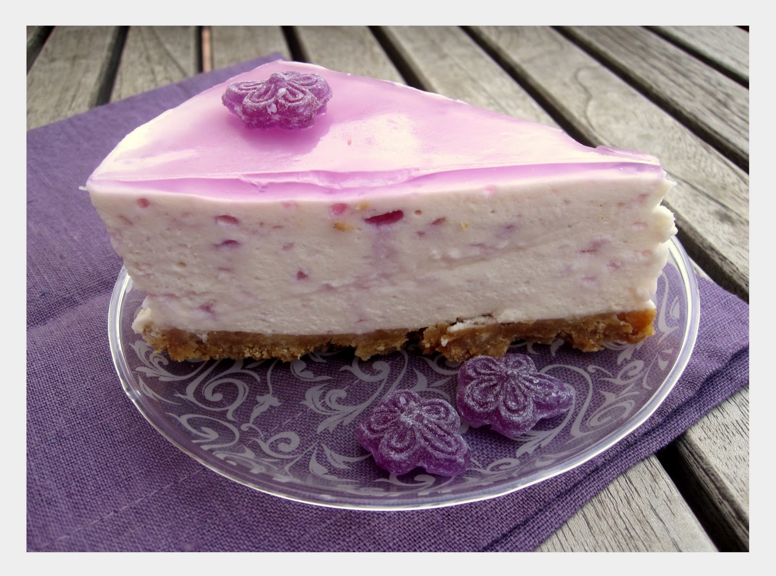 Por fin pude llevar a cabo esta fantástica tarta que, desde que la vi en el blog Mi dulce tentación, me moría de ganas por hacer. El aroma de los caramelos de violeta me recuerda a la infancia, ya que eran unos de mis caramelos favoritos, que me regalaban de vez en cuando, ya que eran un poco especiales. Desde entonces, siempre he sido un poco "fetichista" con la violeta y me gusta probar todo lo que encuentro con ese sabor (helado, té, etc.) y esta tarta no podía ser menos. Es una tarta mousse que se hace sin horno, ligera, ya que no lleva harina y ideal tanto en invierno como en verano para celebrar ocasiones especiales, como en este caso, un cumpleaños.